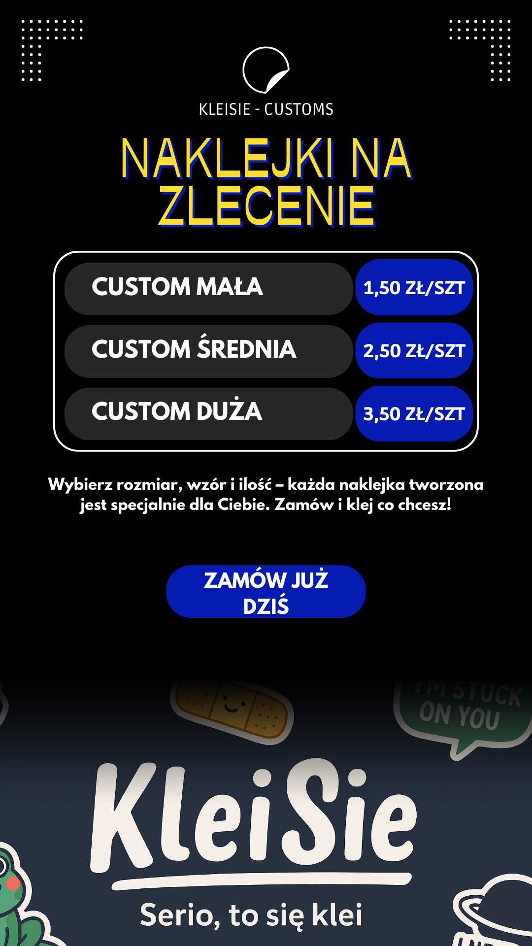Za KleiSie nie stoją żadne korpo-garnitury, tylko zwykli ludzie z naklejkową zajawką, przerostem kreatywności i wiecznym bałaganem na biurku. Wszystko robimy sami: projektujemy, drukujemy, tniemy, pakujemy… czasem nawet z herbatą w jednej ręce i kotem na kolanach.