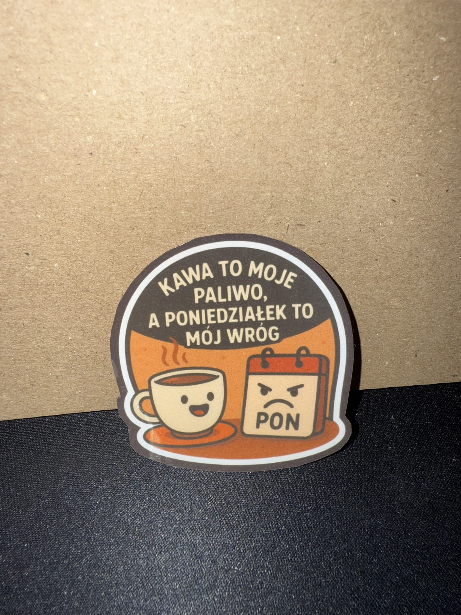 Laminowana, wodoodporna naklejka „Kawa to moje paliwo, a poniedziałek to mój wróg”. Gotowa do użycia, trwała, 5,5×6 cm – idealna na laptopa, kubek czy planer.