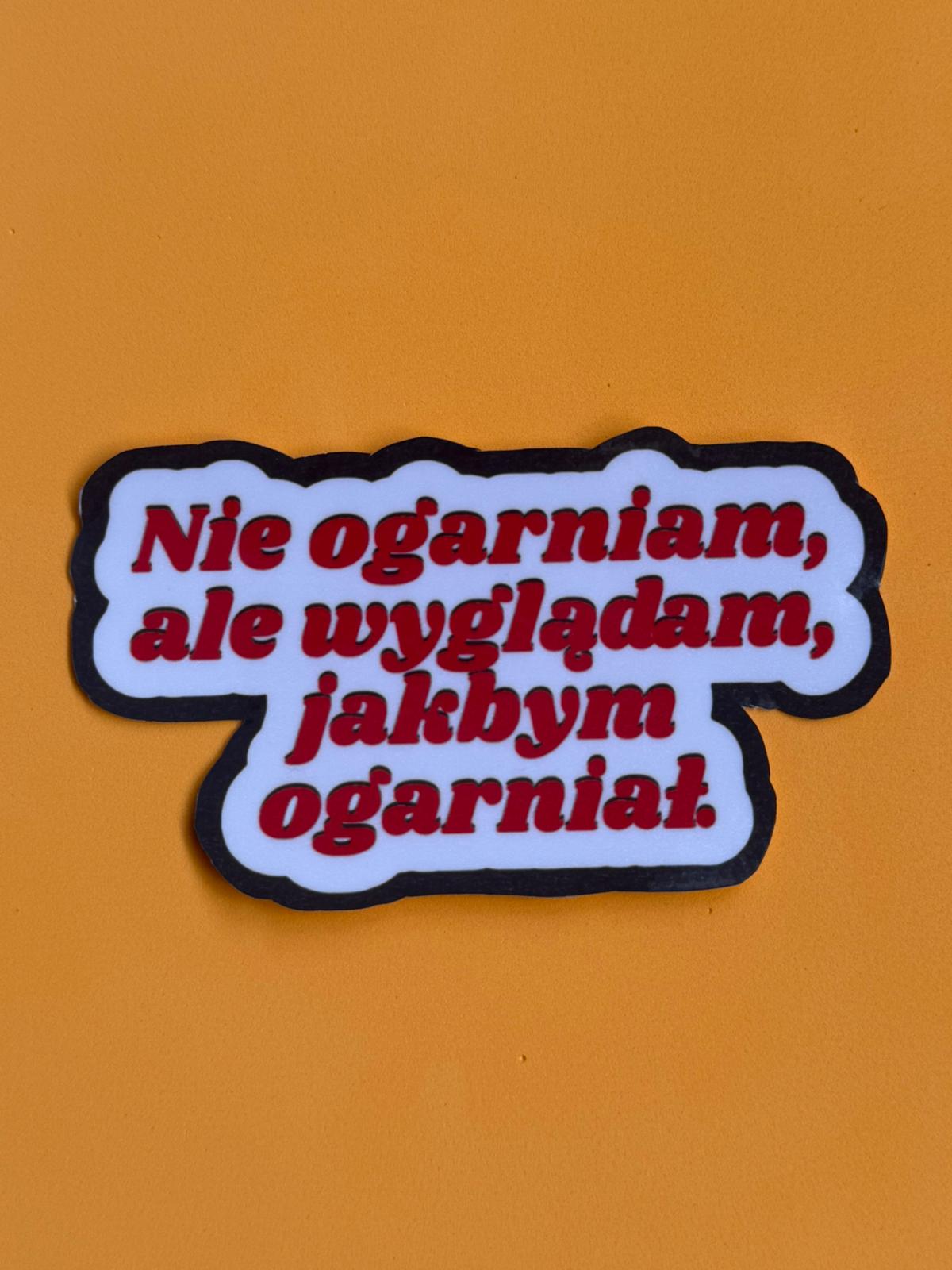 Laminowana, wodoodporna naklejka z napisem „Nie ogarniam, ale wyglądam jakbym ogarniał.” Gotowa do użycia, trwała, 7,5×9 cm – idealna na laptopa, kubek czy planer.