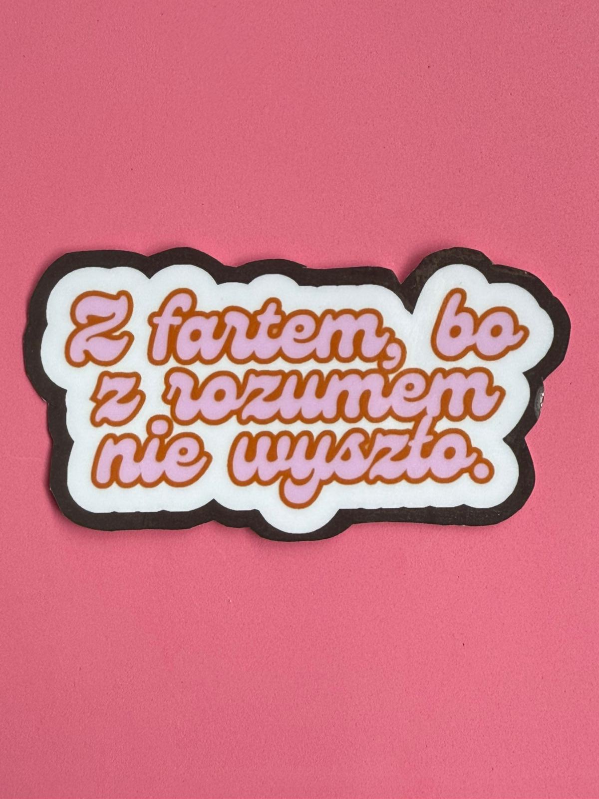Laminowana, wodoodporna naklejka z napisem „Z fartem, bo z rozumem nie wyszło.” Gotowa do użycia, trwała, 10,5 x 5,5 cm – idealna na laptopa, kubek czy planer.