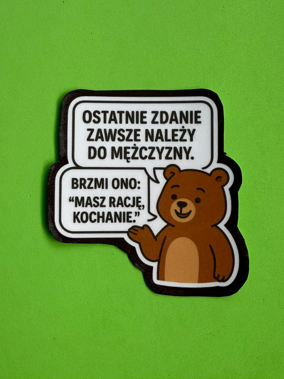 Laminowana, wodoodporna naklejka „Ostatnie zdanie zawsze należy do mężczyzny. Masz rację kochanie”. Gotowa do użycia, trwała, 7,5×8 cm – idealna na laptopa, kubek czy planer.