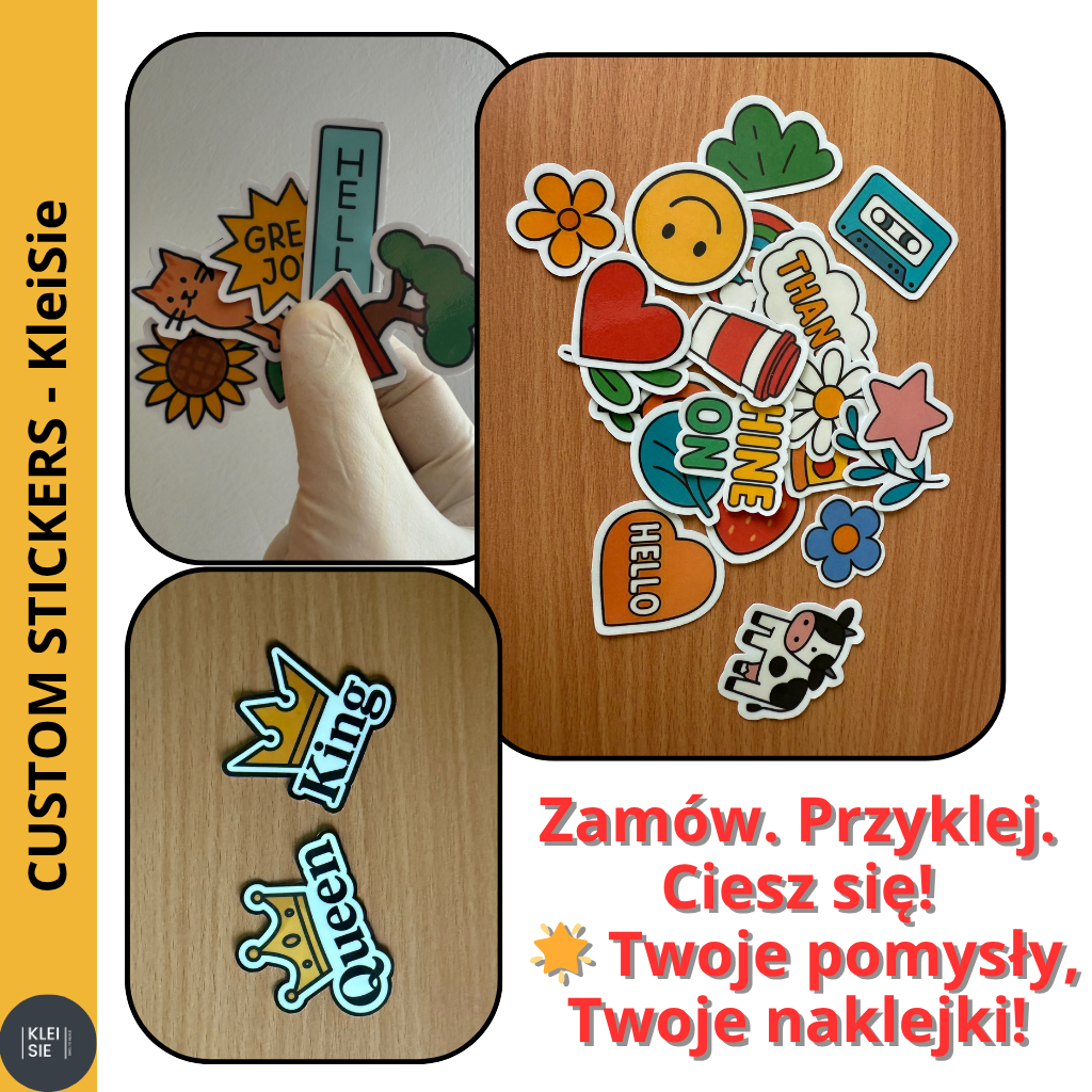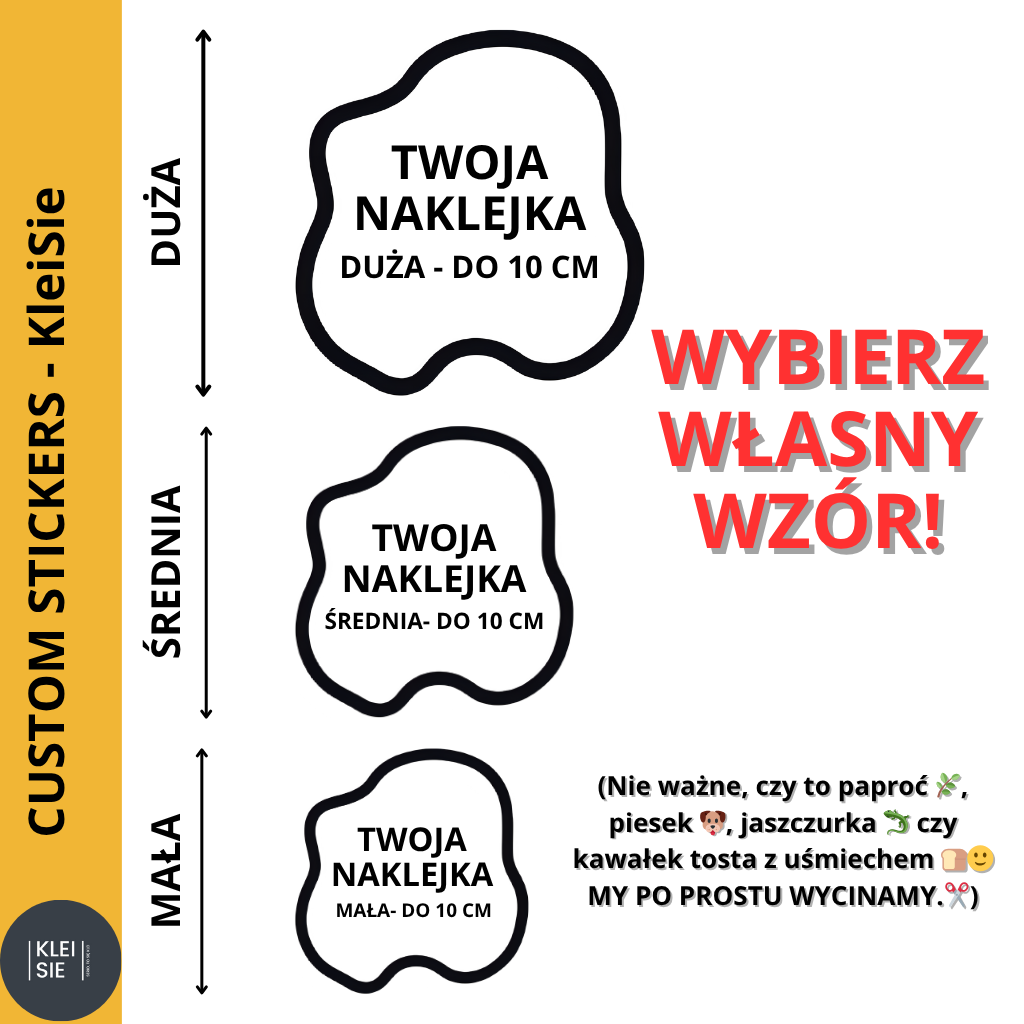 Personalizowane naklejki w 3 rozmiarach (mały, średni, duży). Twój projekt, dowolny kształt, matowe i odporne na zachlapania. Prześlij grafikę i zamów już dziś!